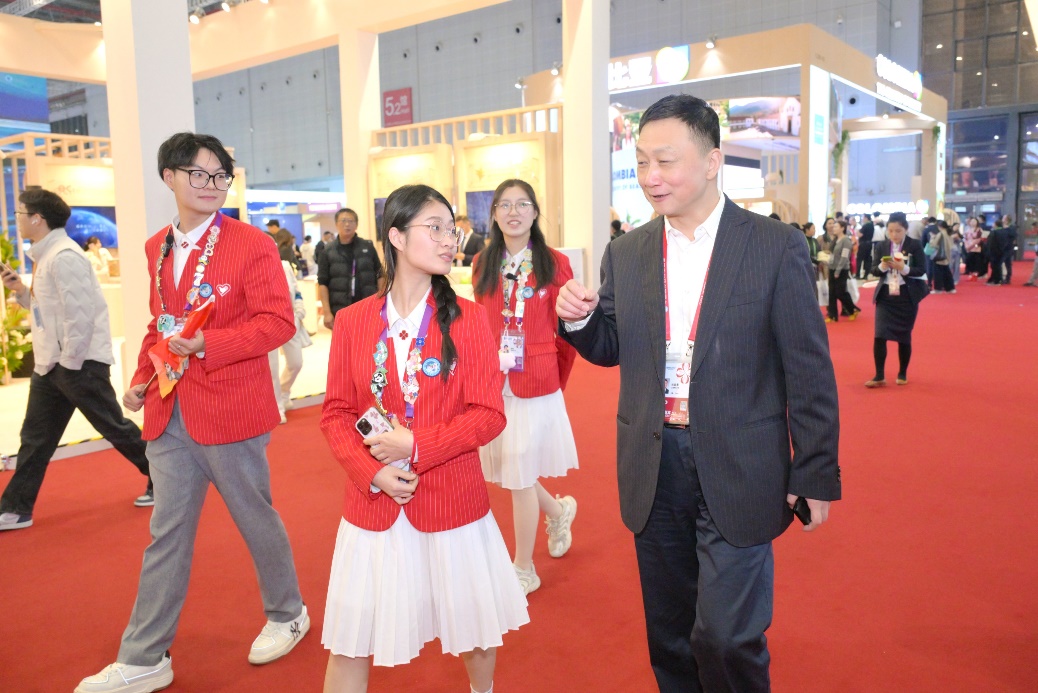 多方守护 落实保障 11月7日下午,校党委书记林在勇、团市委挂职副书记唐志宇,校党委副书记、副校长朱惠军在进博会现场向服务一线的师大“小叶子”们致以亲切慰问。