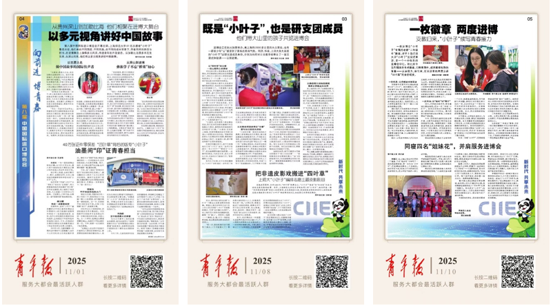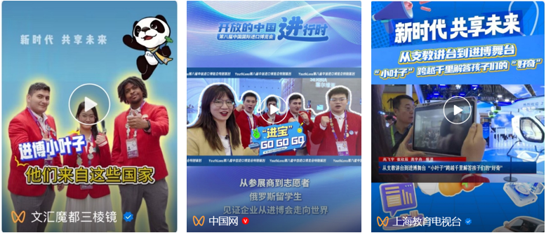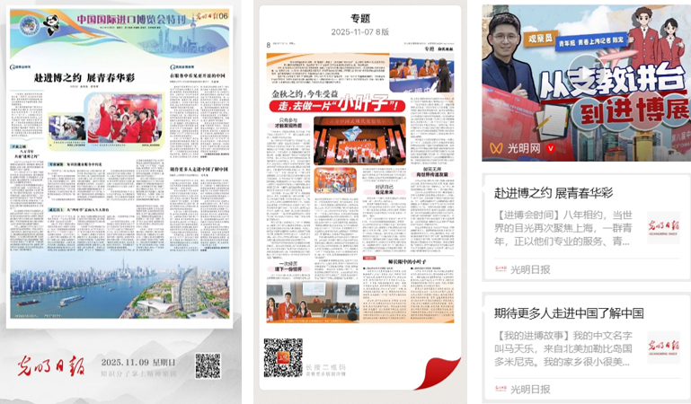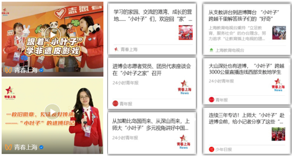 媒体聚焦 闪耀进博 在本届进博会会展期间,多名上海师大“小叶子”的优秀事迹被光明日报、新民晚报、上海教育电视台、青春上海、青年报等多家媒体报道,诠释了新时代青年勇担使命的青春担当。