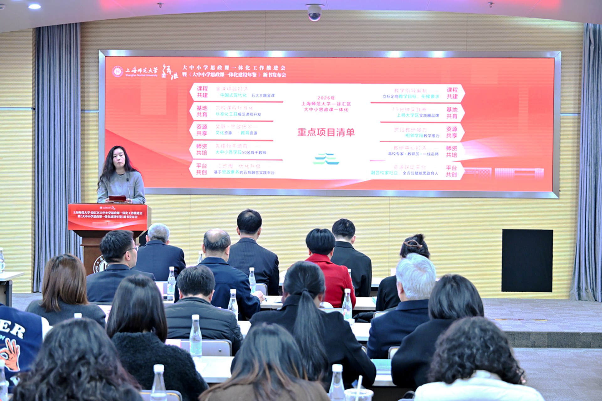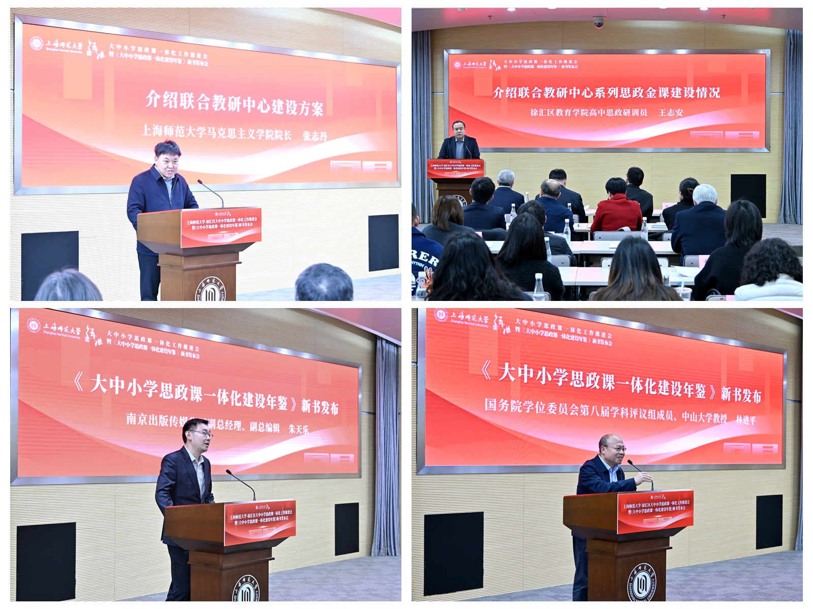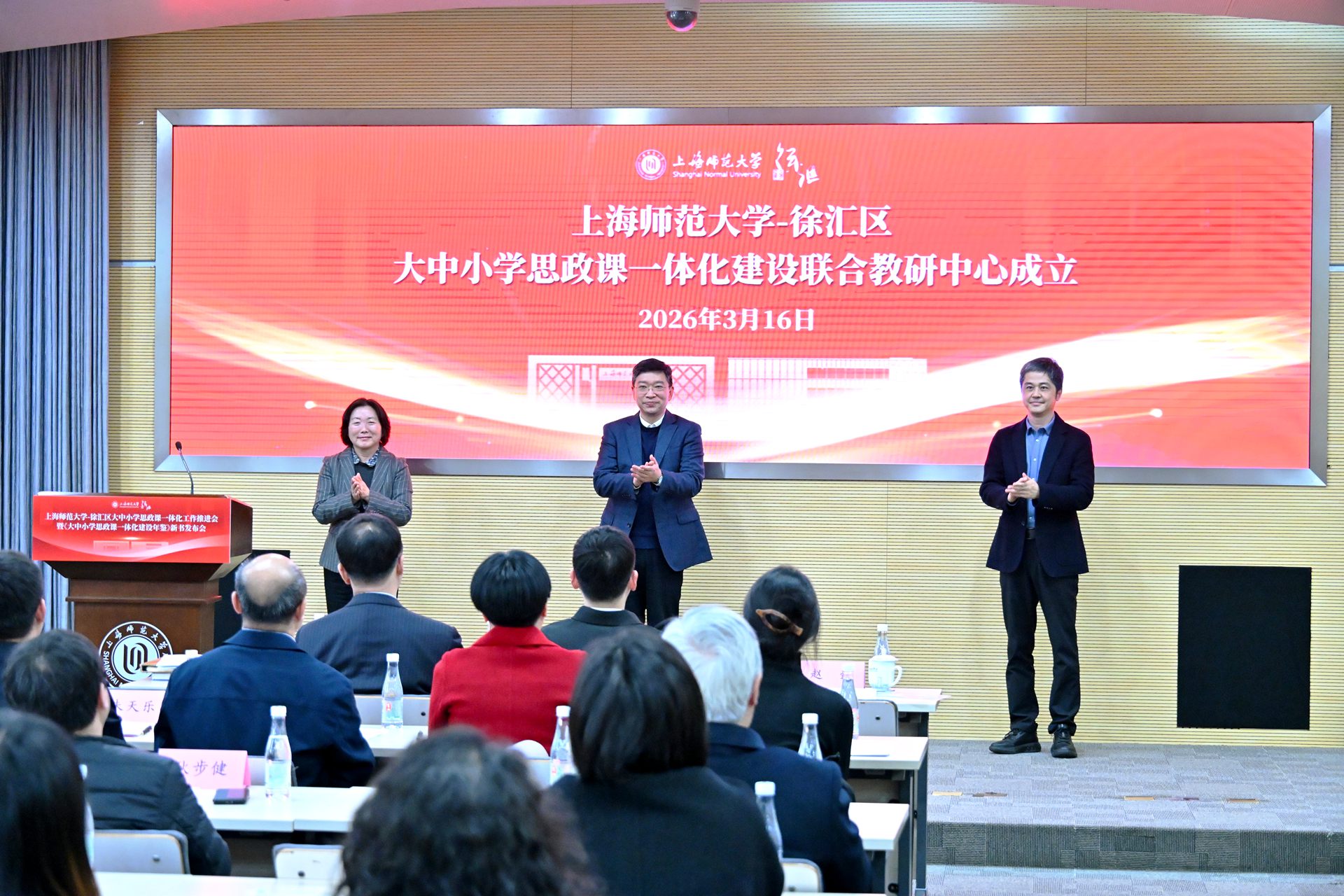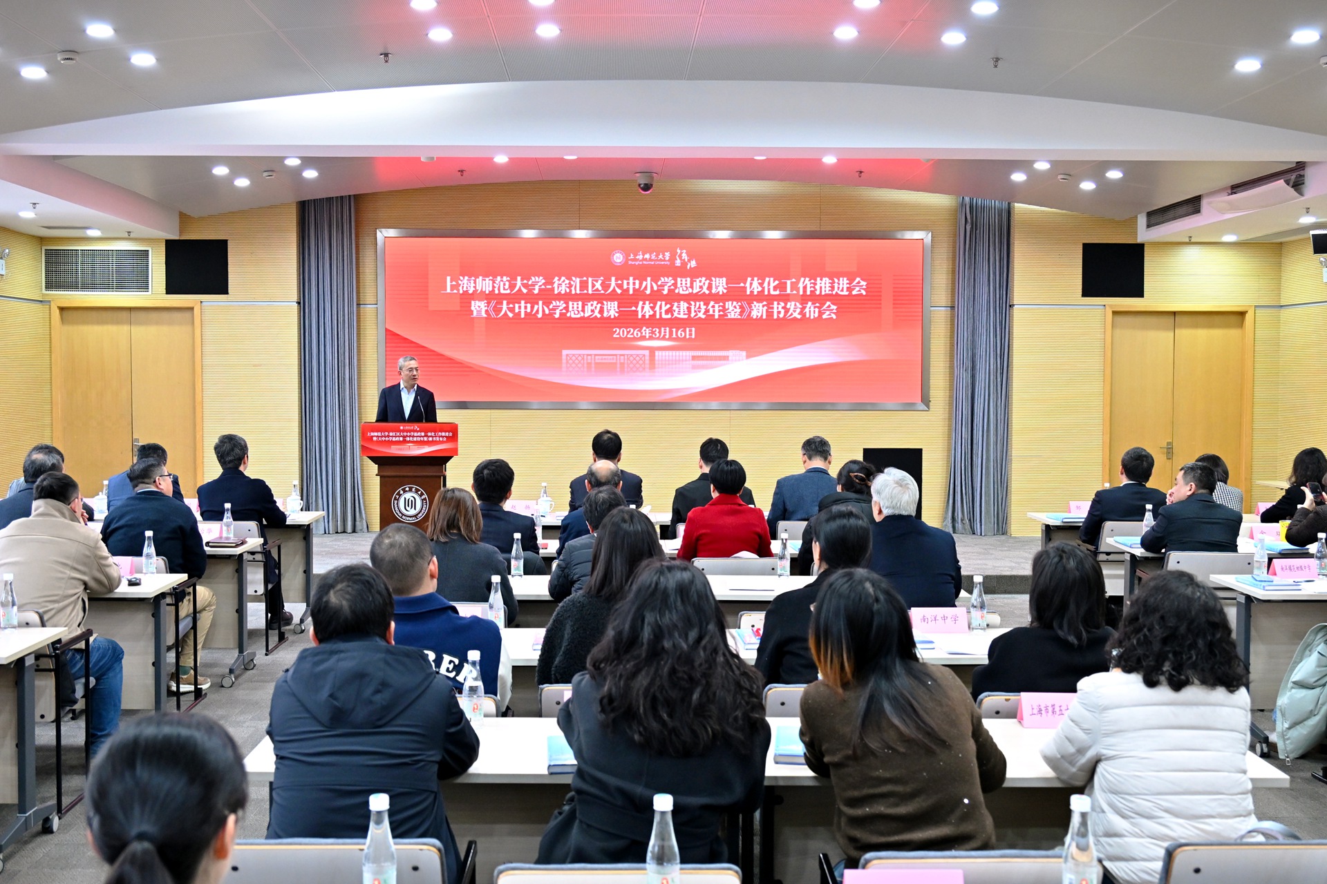 为实施新时代立德树人工程,贯彻落实好教育强国建设的“一号工程”,扎实推进学校立德树人机制综合改革试点高校工作,3月16日,上海师范大学-徐汇区大中小学思政课一体化工作推进会暨《大中小学思政课一体化建设年鉴》新书发布会,在学校西部校区会议中心二号报告厅举行。上海市教卫工作党委副书记顾红亮,校党委书记林在勇,徐汇区委常委、宣传部部长赵懿等领导出席会议并讲话。上海市教委德育处、徐汇区教育局、徐汇区教育学院、龙华烈士陵园、南京出版传媒集团、徐汇区中小学校、兄弟高校以及校党委宣传部、马克思主义学院师生代表等参加会议。会议由校党委副书记、副校长赵扬主持。