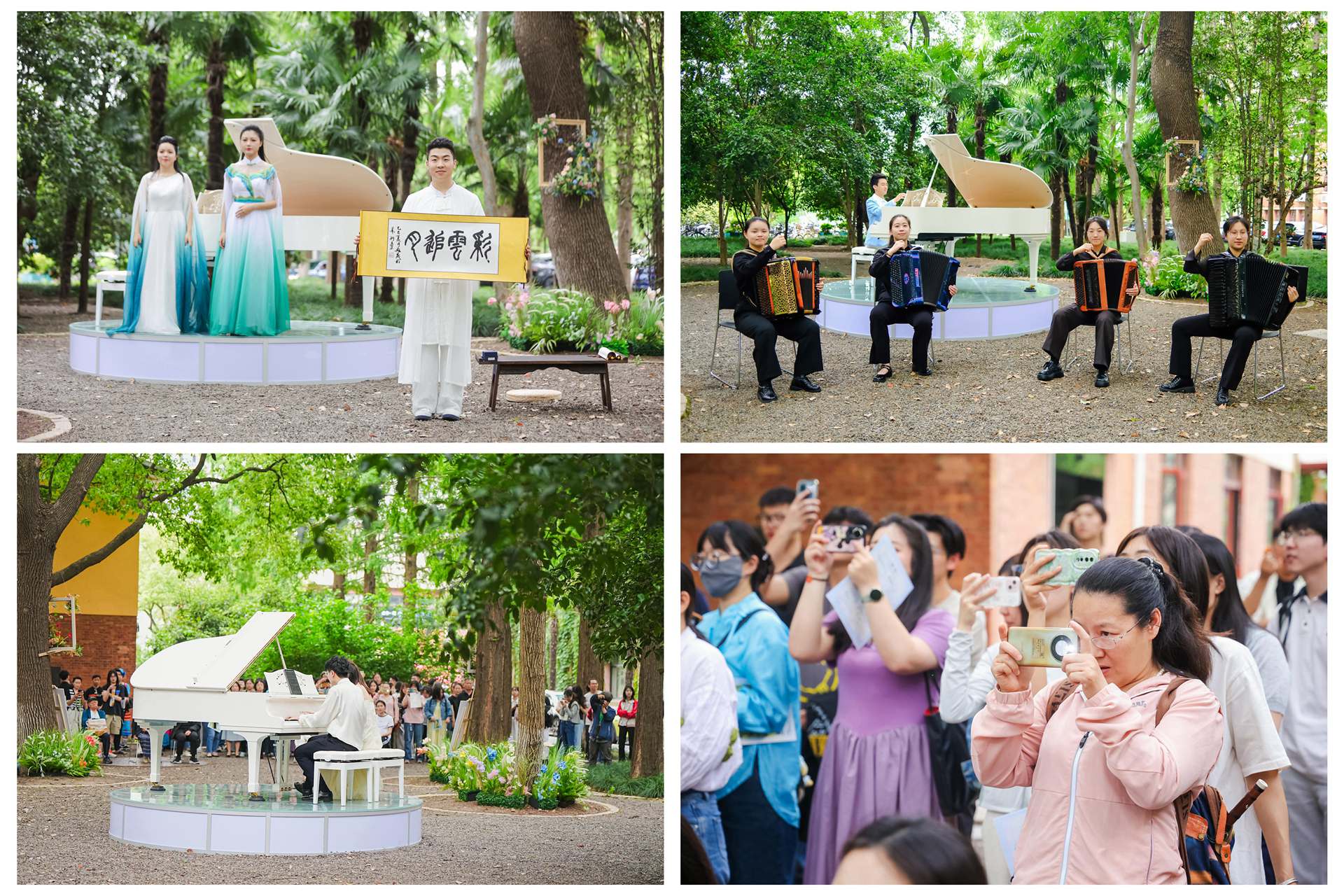 5月28日,沉浸式钢琴音乐会《和·鸣》在徐汇校区艺术森林精彩上演。校领导,宣传部、学工部等相关职能部门负责人与师生共同欣赏了这场自然与艺术交融的森林音乐会。