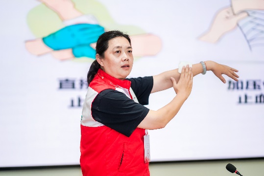 赋能增效:助力“小叶子”绽放进博 上岗宣誓仪式后,我校聚焦理论学习、能力素养、医疗应急、志愿青春四大板块开展校内培训,与市级培训、岗位实训构成“三阶”体系。马克思主义学院讲师陈晓静以“树立全球视野,理解大变局中的国家作为”为主题,将理论学习融入经济全球化的战略机遇,引导“小叶子”在新时代新征程中勇担使命。徐汇区红十字应急救护培训核心师资、主管护师周小红带来干货满满的急救知识,现场演示如何使用AED,介绍气道梗阻的紧急处理策略。礼仪培训老师朱婷婷结合自身参加工博会、世界人工智能大会等大型赛事服务培训经历,从着装、表情、仪态等方面开展礼仪规范指导。人文学院二年级“小叶子”杨逸鸥从责任、纪律、收获、成长四个维度,分享自己与进博的故事,激励志愿者珍惜机会、绽放青春,实现成长与突破。