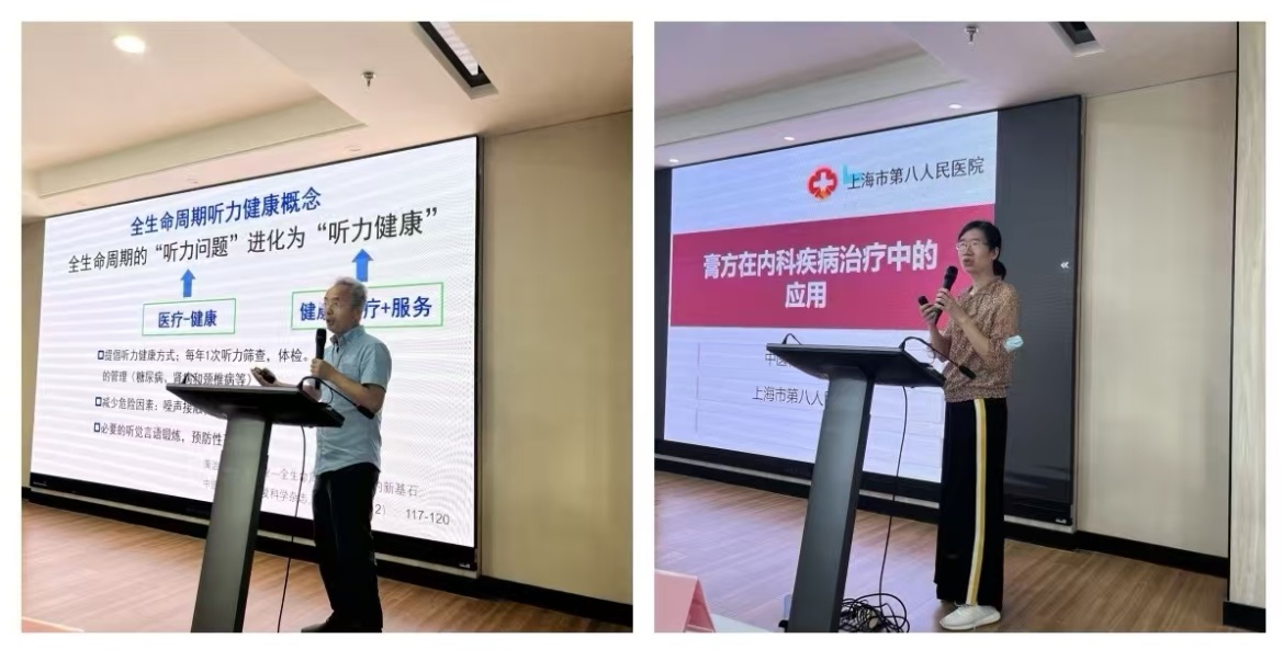 启动仪式之后,上海交通大学医学院附属第九人民医院耳鼻咽喉头颈外科副主任兼听力中心主任黄治物教授作了关于听力健康的精彩讲座。他结合权威数据和生动临床案例,深入剖析了老年性耳聋具有“渐进性、不易觉察性、普遍性”的发病特点,强调了听力认知健康早期发现和干预时机的重要性,阐释了“听力与言语”联合检测对认知障碍筛查的独特价值。上海市第八医院中医内科主任张素琴从中医养生的角度出发,为老同志们带来了关于中医保健的实用知识讲座。她介绍了中医养生、智慧调理身体机能的相关理念,耐心讲解了中医用药注意事项以及中药膏方调理与应用等健康知识。两位专家深入浅出、通俗易懂的讲解,有效消除了老同志们对于健康认知的误区,帮助老同志们树立了科学健康管理的理念。