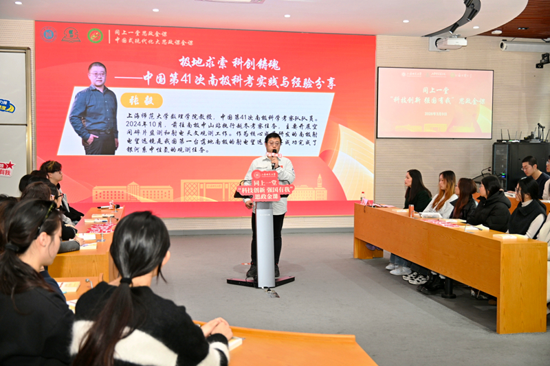 3月9日,学校在徐汇校区第六教学楼108报告厅举行以“科技创新 强国有我 为实现高水平科技自立自强贡献青春力量”为主题的大中小学“同上一堂‘科技创新 强国有我’思政课”。校党委书记林在勇,中国第41次南极考察队队员、学校数理学院教授张毅,马克思主义学院思政教师徐蓓,上海市实验学校道法课教师胡尔姝,上海市中国中学高中政治课教师兰银飞围绕“科技创新 强国有我 为实现高水平科技自立自强贡献青春力量”主题,共同为大中小学生授课。校党委副书记、副校长赵扬,校党委宣传部、马克思主义学院及上海市实验学校、上海市中国中学等负责人参加。